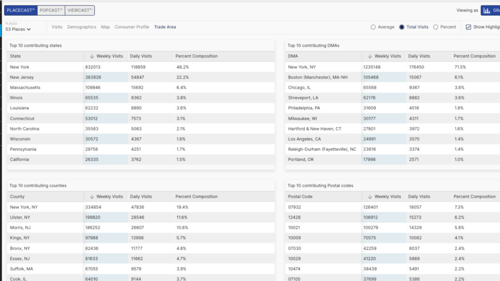 Get a macro-level view on all your business locations, competitor locations, and regional areas of interest in one dashboard. Analyze your core demographics, consumer behaviors and foot traffic trends to plan your business on reliable location data.