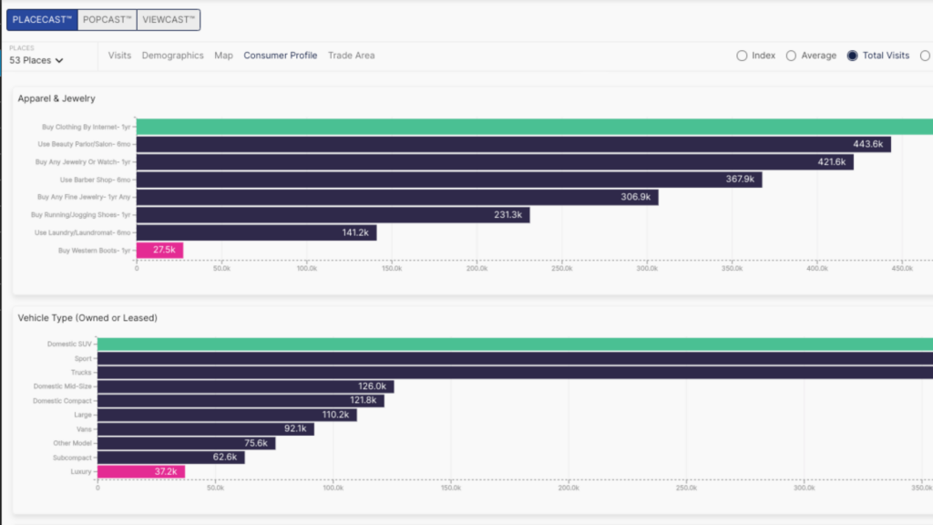 Understand your customer on a deeper level to develop promotions, partnerships, offers and events that resonate. Get insights into how they shop, what they drive, where they like to eat, how long they commute, and much more.